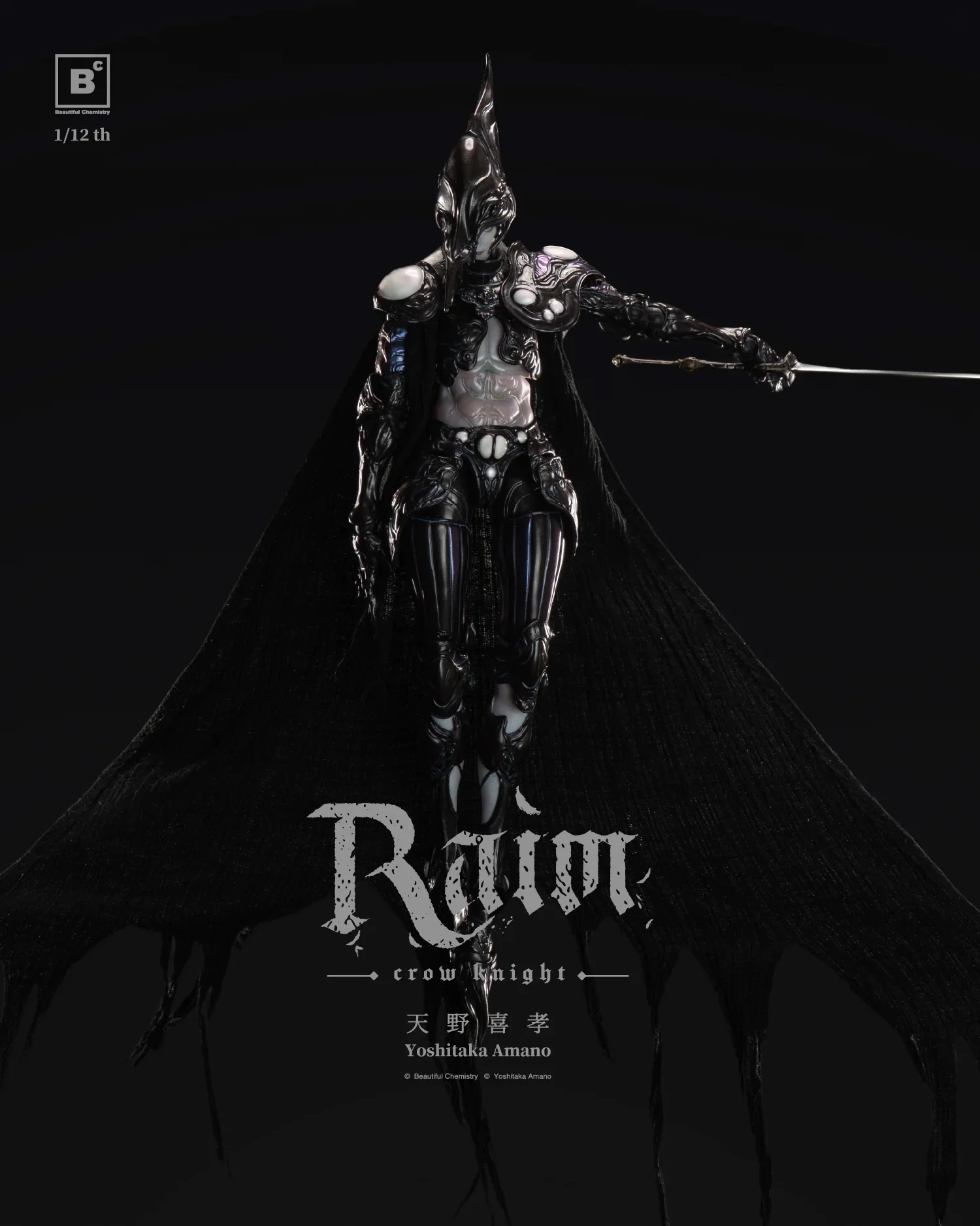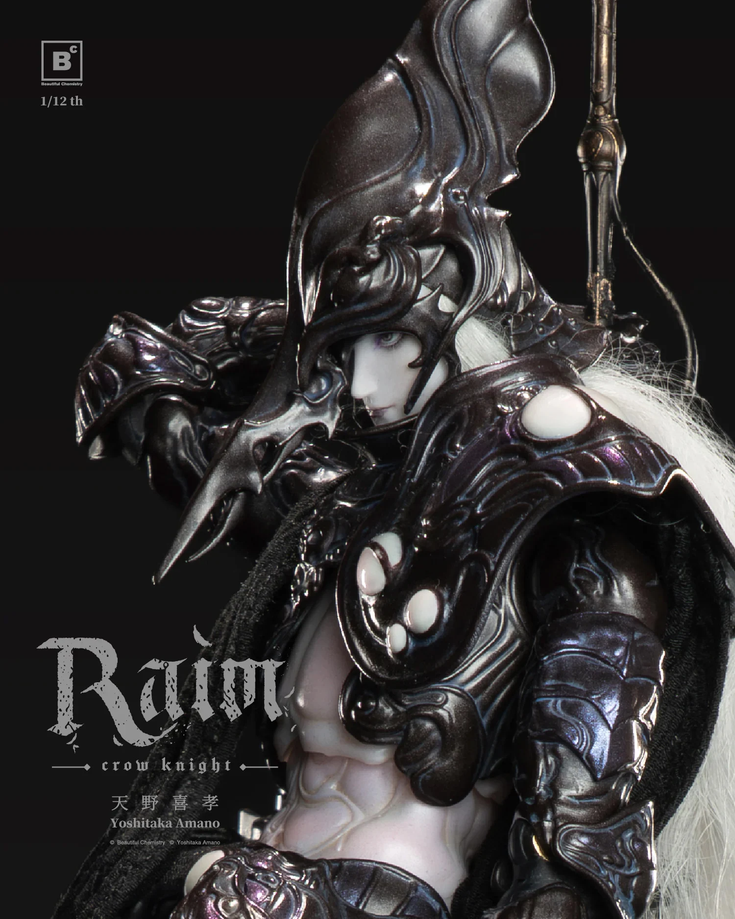 The Beautiful Chemistry Crow Knight Raim features exquisite detail and build quality along with highly detailed paint work. Beautiful Chemistry’s first 1/12 scale action figure features flowing implanted wool hair along with an aesthetic comparable to Yoshitaka Amano Vampire Hunter D – “Mystic Raven Knight – Raven Hunter Raim.”