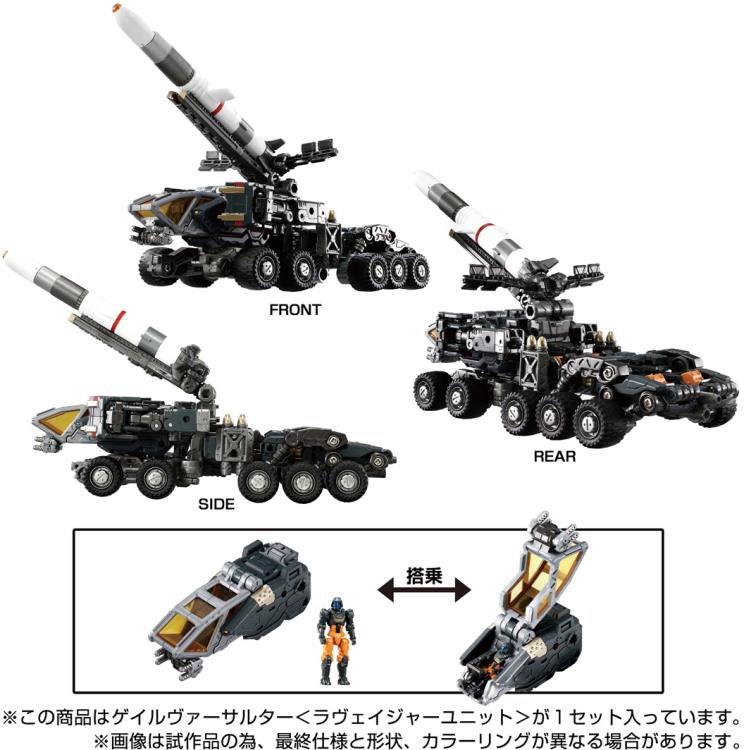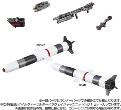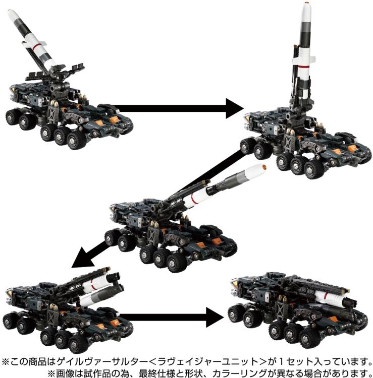 The attack process of the Gale Versalter equipped with the Ravager Unit is to destroy the target located at a long distance with its main weapon, the drone-type FZ guided missile, pursue it with super-speed movement, and complete the target with a mopping-up maneuver that makes full use of various weapons. It is common to use a pattern of destroying, or a hit-and-away strategy such as approaching the target of destruction by running at super-speed to a position where it cannot be intercepted, firing a drone-type FZ-guided bullet at close range, and moving away at super-speed.