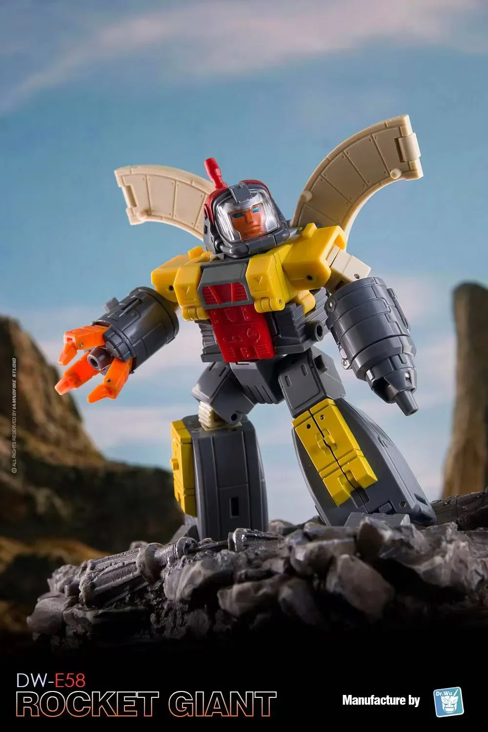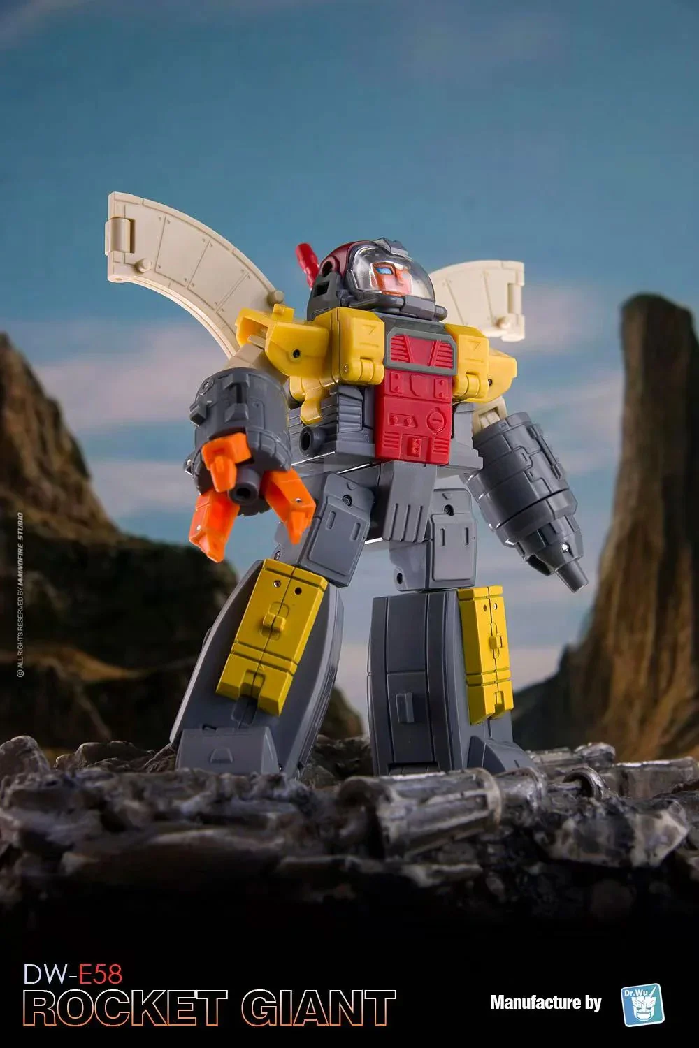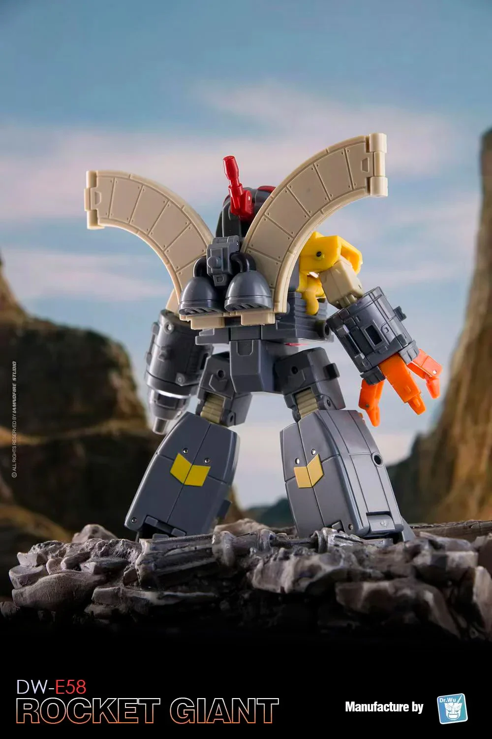 Dr Wu DW-E58 Rocket Giant transforms from a fully articulated robot action figure to base mode and back again. He can also form a cube for stacking and storage! Rocket Giant comes with 2 mini robots to assist him in his defense duties. Rocket Giant stands approx 3.2 inches tall in robot mode.