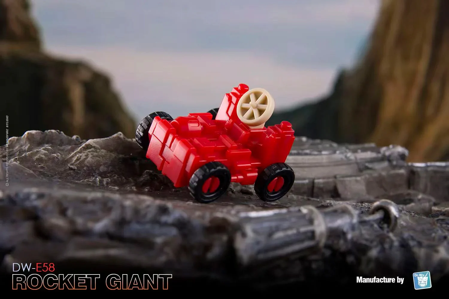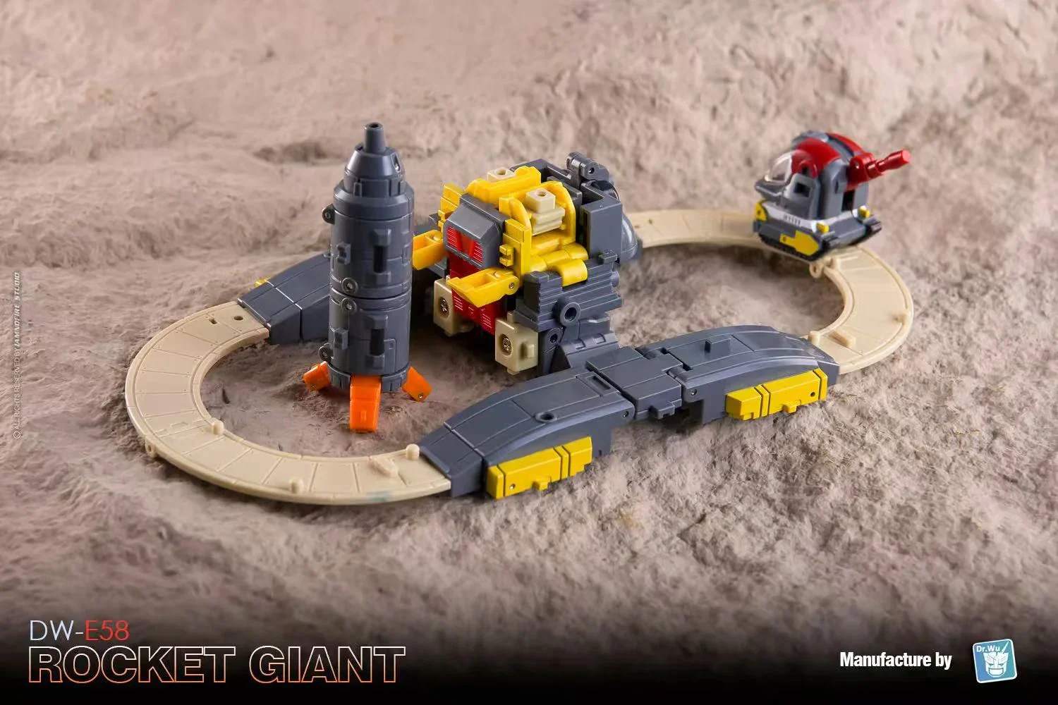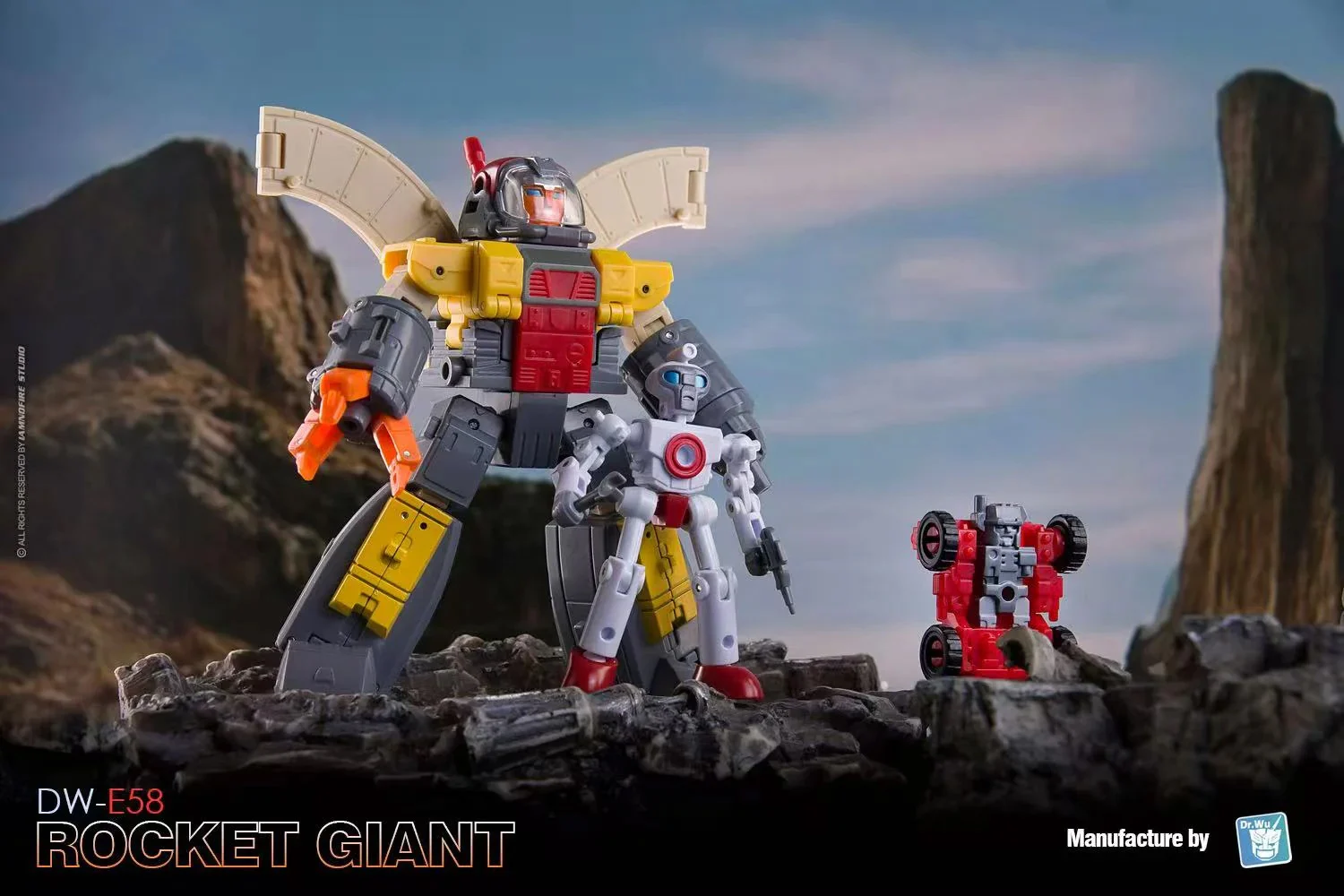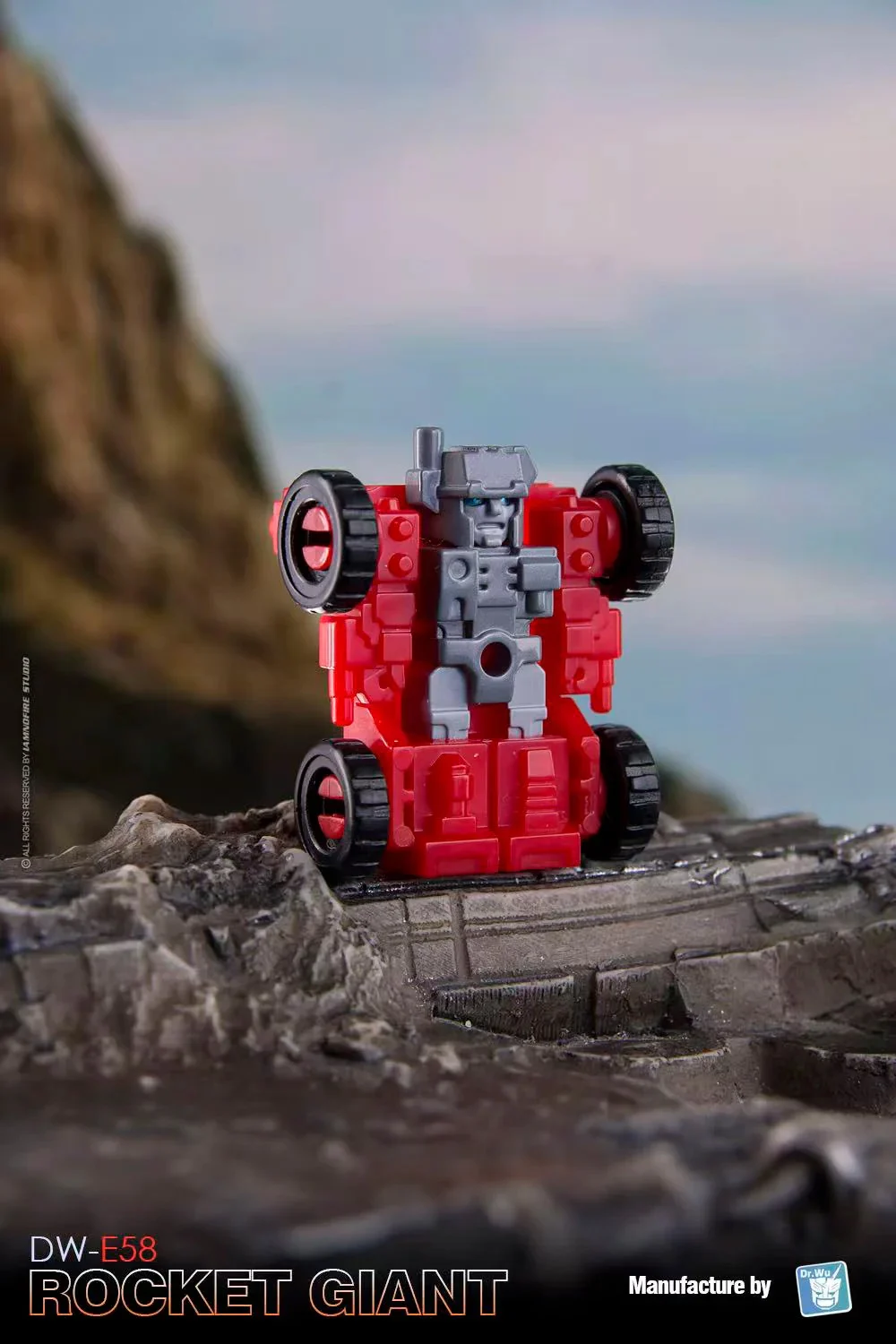 Dr Wu DW-E58 Rocket Giant transforms from a fully articulated robot action figure to base mode and back again. He can also form a cube for stacking and storage! Rocket Giant comes with 2 mini robots to assist him in his defense duties. Rocket Giant stands approx 3.2 inches tall in robot mode.