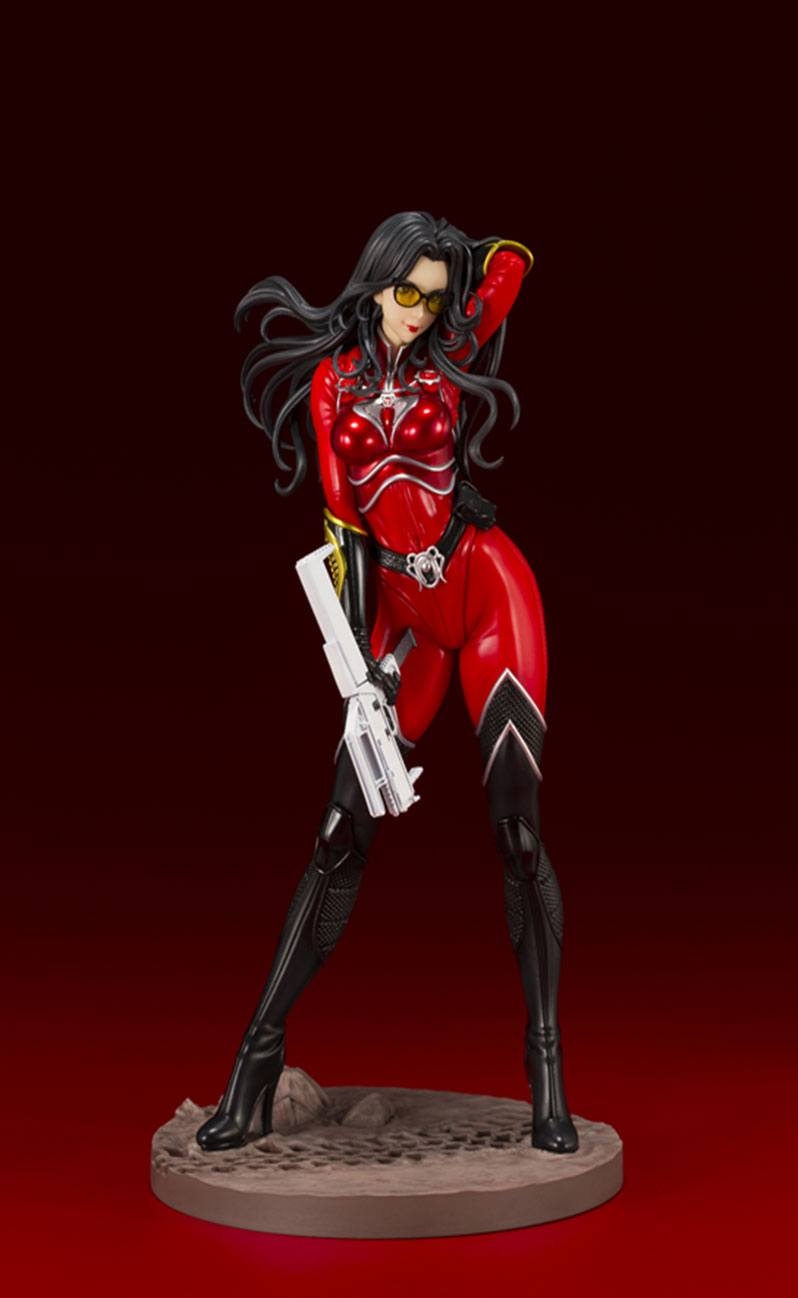This limited edition statue is based on an exclusive version of Baroness that was originally released by Hasbro in 2002. This version of Baroness stays true to its name, “Crimson Strike Team”, by the uniform being painted in a dark red coloration. The chest armor and boots have been painted a silver-green, creating a bright and stark contrast between the colors in Baroness’ outfit.
