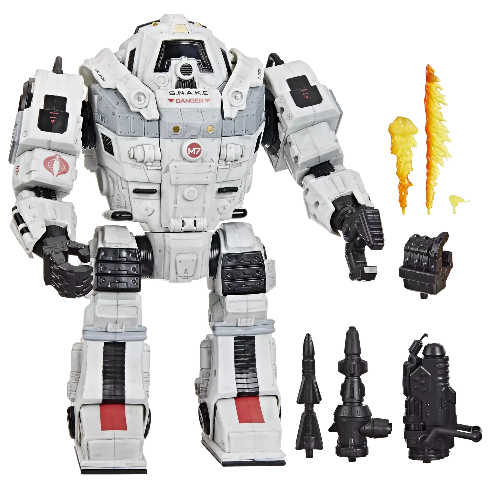 New to the G.I. Joe Classified Series line, Cobra S.N.A.K.E (System: Neutraliser – Armed Kloaking Equipment) Battle Suit comes ready for adventure, with multiple points of articulation for high poseability. The battle suit fits most 15-cm action figures (sold separately) inside the cockpit. This Battle Suit contains 15 character-inspired accessory pieces including missile, 2 wrist coupling pieces, 2 hands, flamethrower with 3 flame effects, power claw, laser cannon, jetpack and 2 fuel tanks; plus a hinged entryway. Designed by Destro and his scientists the Cobra S.N.A.K.E. is a powerful battle suit whose heavy armour plating protects Cobra troopers. When captured G.I. Joes are placed inside, its powerful sensors easily brainwash them into thinking and acting like Cobra.