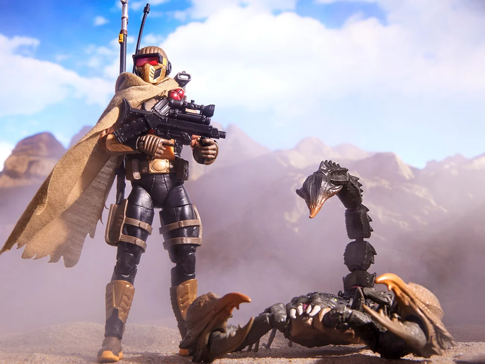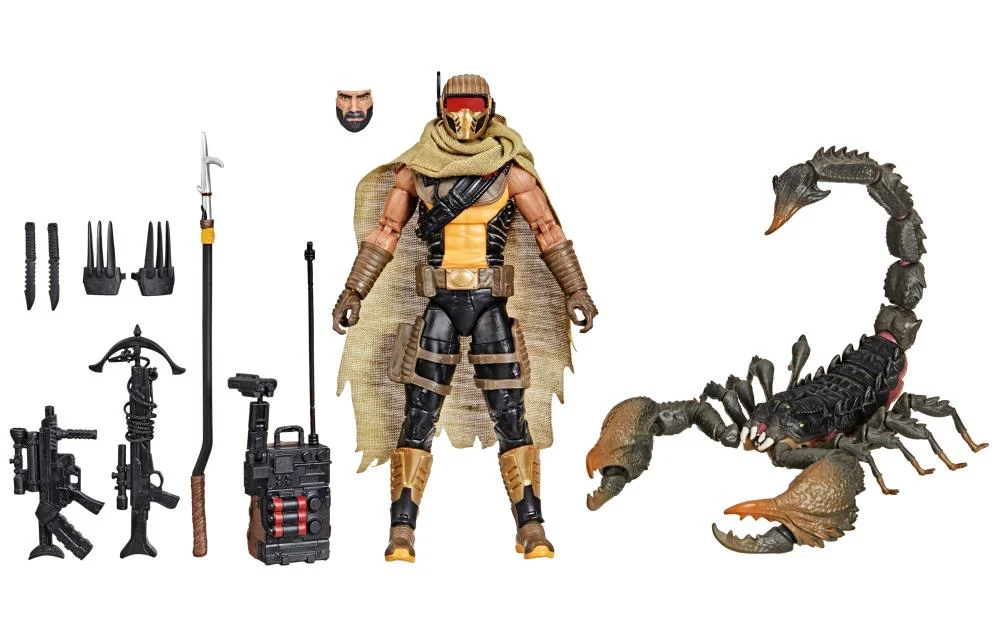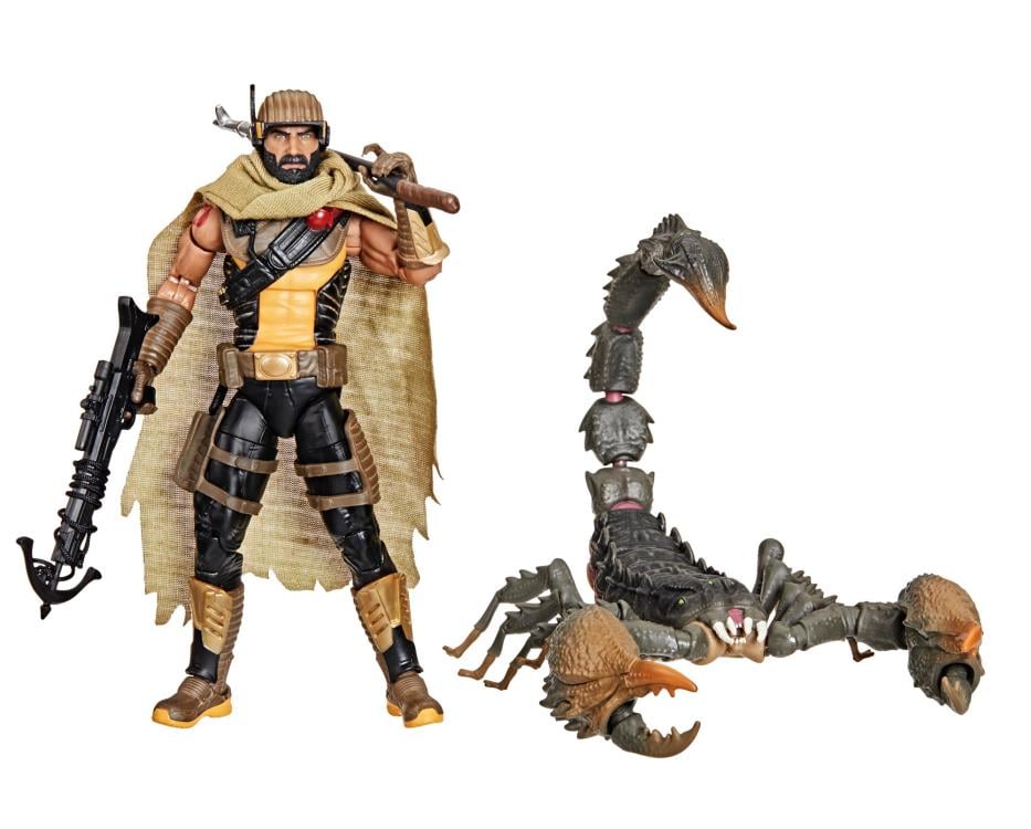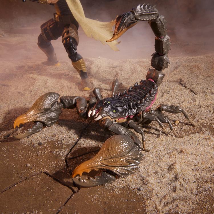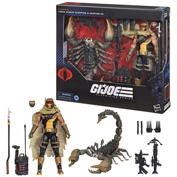 New to the G.I. Joe Classified Series line, Cobra Desert Scorpion & SKRP10N-25 pet come ready for adventure, with multiple points of articulation for high poseability. This Cobra Desert Scorpion figure contains 12 character-inspired accessory pieces including swapable faceplate for multiple looks, backpack with connecting cord, 2 knives, grapple launcher with removable hook and attached line, scorpion prod, 2 claws, and weapon accessories; plus softgoods cape and helmet skirt. SKRP10N-25 is a fully articulated colossal pet with massive claw pincers and unattached tail piece.