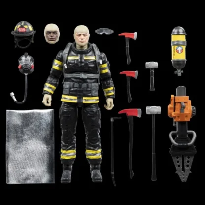 This Firefighter figure is bursting with 14 character-inspired accessory pieces including alternate head, helmet, mask, air tank, hose, goggles, hydraulic rescue tool, 2 hand axes, fire axe, pry bar, hammer, sledgehammer, and softgoods emergency blanket.