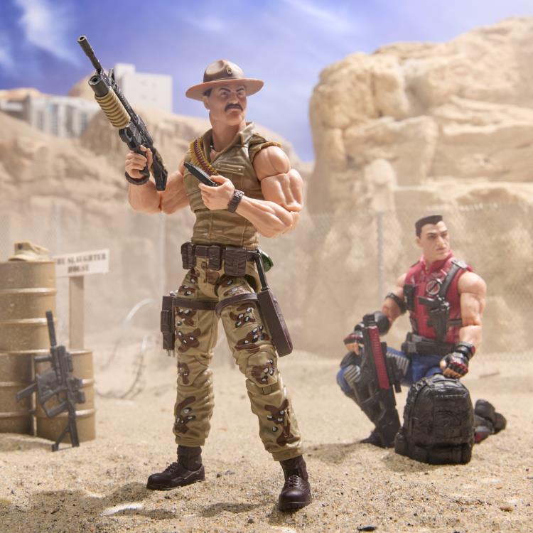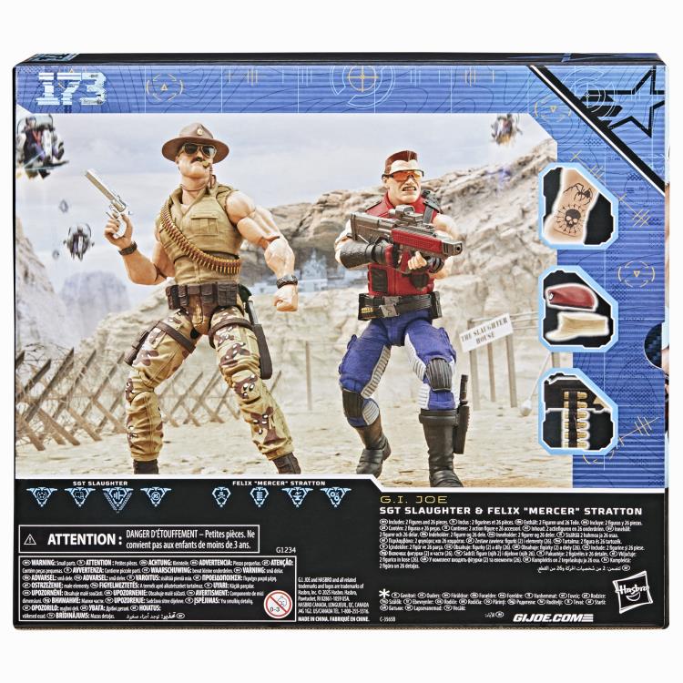New to the G.I. Joe Classified Series line, Sgt Slaughter & Felix “Mercer” Stratton comes ready for adventure, with multiple points of articulation for high poseability. This Sgt Slaughter & Felix “Mercer” Stratton deluxe figure set is bursting with 26 character-inspired accessory pieces. Sgt Slaughter includes alternate head, 3 alt hands, utility cover, beret, baton, knife, and weapons accessories; plus his signature sunglasses, whistle, and iconic campaign cover. Mercer includes glasses, alternate head, 2 alt hands, knife, backpack and weapon accessories.