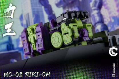 Riki-Oh Set C contains 2 x 3.5 inch transforming action figures. Bulldozer transforms from futuristic earthmover to cube then to robot and back again. Arm Digger transforms from earth mover to cube then robot and back again. Each figure comes with weapons and can form part of the 6 piece Riki-Oh combiner robot ( other sets sold separately ) Also included are a mini storage shelf and storage cubes which can be disassembled and rebuilt into various display shelves for the figures.