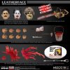 The One:12 Collective Leatherface comes complete with 3 equally gruesome head portraits, including the infamous “Pretty Woman” and “Old Lady” masks as seen in the film. He is outfitted in a short-sleeved collared shirt and tie, Pam’s bracelet on his wrist, slacks, and cowboy boots. Also included is a removable suit jacket that Leatherface can wear with his “Pretty Woman” mask and an additional removable apron that he can wear with his “Old Lady” mask. Leatherface packs a nightmarish arsenal including a chainsaw with revving sound with 2 add-on blood splatter FX, a mallet with add-on blood splatter FX, a cleaver, a bone knife, and a bucket.