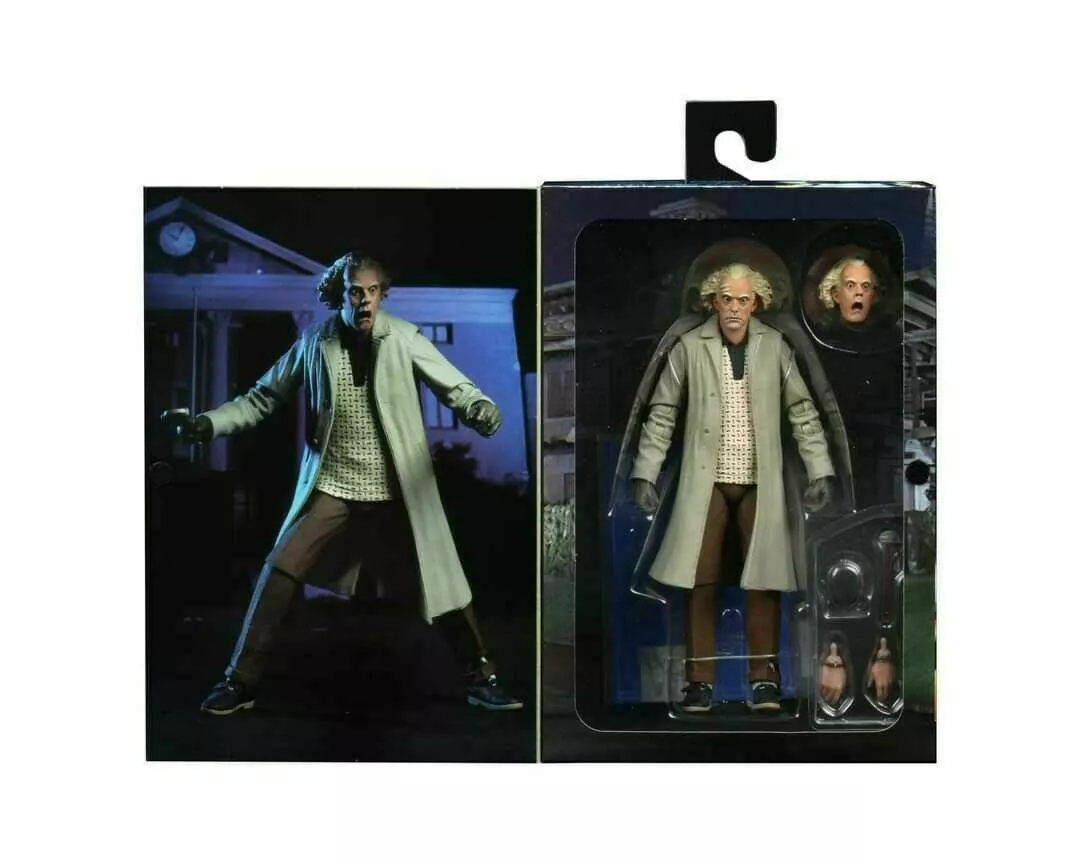 Great Scott! Doctor Emmett Brown, the genius behind the first time machine and one of the greatest movie characters of all time, is joining NECA’s Ultimate line. Using the official licensed likenss of actor Christopher Lloyd, Ultimate Doc Brown is based on his 1955 appearance in Back to the Future with 2 interchangable heads portraying a generic expression and the iconic shocked expression.