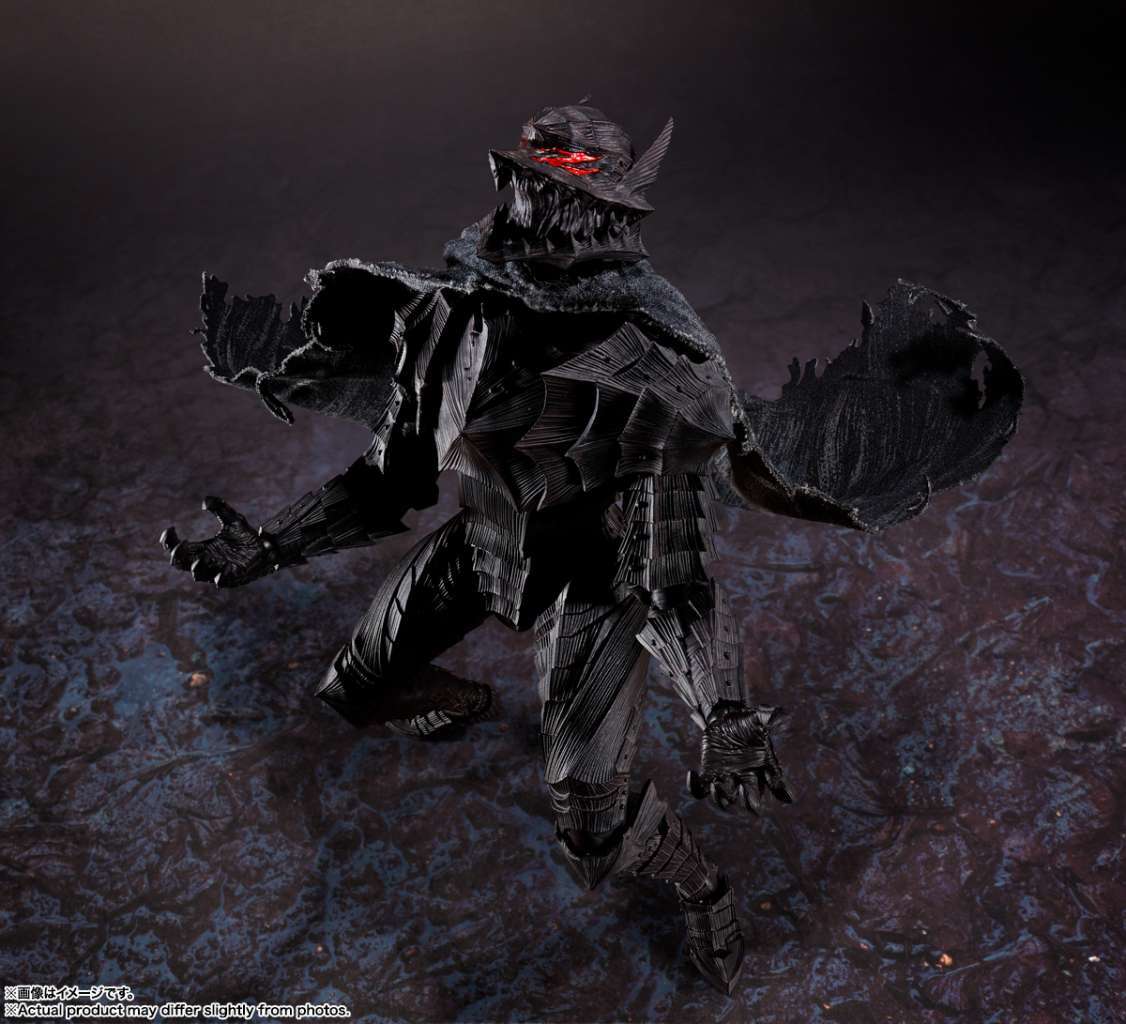Guts from “Berserk,” the monumental dark fantasy that’s popular worldwide, gets a new “S.H.Figuarts” action figure from Bandai — this time in his “Beast of Darkness” state! This figure is modeled from the skeleton outward, to achieve natural proportions and movement. Part of the main body is brush-painted to give it a solid appearance, and the Beast’s eyes are painted with metallic paint for a sinister appearance! An interchangeable head is included for the skull version, and also for the sane version; each face is digitally printed to faithfully reproduce all the details of the original illustration! Replacement legs are also included so you can recreate the beast-like pose of Guts in the Beast of Darkness state. Other replacement parts allow you to reproduce the cannon-firing scene! A fabric cloak is included too. This incredible figure would be the ultimate addition to any “Berserk” collection .
