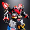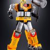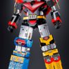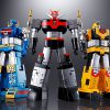 A new release of the GX-60 Soul of Chogokin Godsigma with new weapons! Combine the three sub-robots, Sea King, Land King, and Sky King, into the massive Space Emperor Godsigma! It has been seven years since the release of the original GX-60. Now this popular super robot gets a “renewal” with some new features and the addition of new weapons God Tomahawk, Spin Saucer, and more. New features include a re-designed chest “V” for added realism, and added chroming of the weapons. The wings on the back convert into a scabbard for Godsigma’s sword, letting you replicate dramatic scenes from the anime! The set includes Sky King (figure, optional hands, two optional shoulder rods, two internal knee joint parts, a sword, and a bow and arrow); the Sea King (figure, two optional hands, Water Gun and two double chains.); the Land King (figure, two optional hands, Attack Drill, and assault hammer); Big Wing; three pairs of Godsigma fists; a Legendary Sword; a scabbard; a sword attachment part; a shield; two God Tomahawks; two Spin Saucers; a Sigma mark buckle; a weapon stand; a Big Wing stand; and instructions.