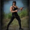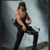 1/6 John Rambo collectible figure stands approximately 11.82″ (~30cm) tall. The lifelike head sculpt comes wrapped with the iconic red headband, and the figure features a sturdy body with multiple points of articulation and a distinct muscular physique. The clothing of the figure faithfully replicates the black-themed attire from the film, including a shirt, tank top, and cargo pants-all made with real fabric. The costume comes together with weathered military boots and tactical belt, which conceals hidden pockets for throwing knives. The attention to detail in capturing the essence of the movie character is truly commendable, paying homage to every intricate detail from the original film.