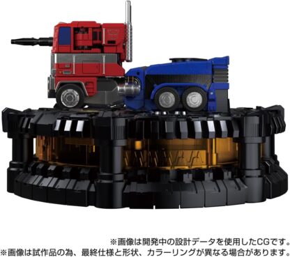 Press and hold the button to “Cybertron Warrior Transform! The center of the base rotates along with the voice of the “Convoy rises, transforming into robot mode.