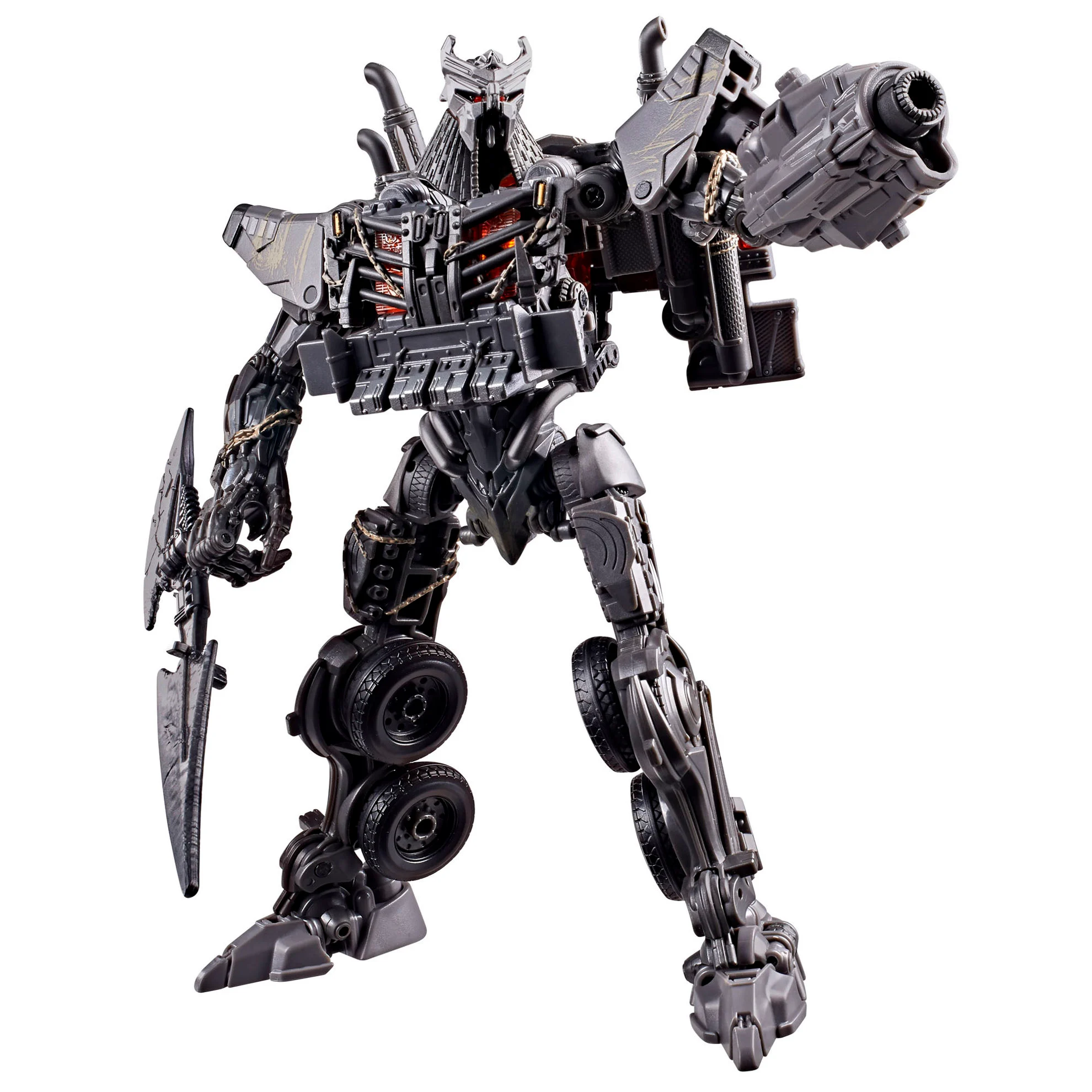 This 8.5-inch (21.5 cm) figure converts from a robot action figure to a truck in 31 steps. With movie-inspired details, intricate poseability, and attachable accessories like a blade, blaster, and claw hand, this Scourge action figure makes an awesome addition to any Transformers collection.